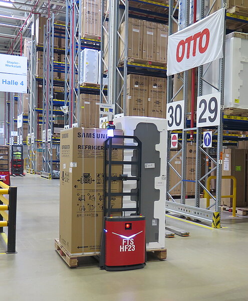 Sensoren sorgen dafür, dass die Fahrzeuge Hindernisse erkennen und rechtzeitig ausweichen oder abbremsen, wenn nicht genügend Platz zum Umfahren vorhanden ist. „Sicherheit hat bei uns im Logistikzentrum höchste Priorität“, sagt Thomas Saltenbrock. Deshalb werden die Mitarbeitenden im Kontakt mit den mobilen Robotern geschult. Auch an geänderte Vorfahrtsregelungen müssen sich die Beschäftigten gewöhnen: Die selbstfahrenden Ladungsträger haben immer Vorrang – sowohl vor herkömmlichen Flurförderzeugen als auch vor Mitarbeitenden, die im 100.000 Quadratmeter großen Logistikzentrum zu Fuß unterwegs sind. Das interne Verkehrskonzept wurde entsprechend angepasst.