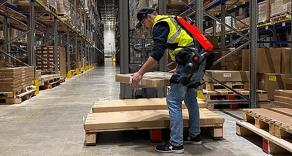 Um die Gesundheit der Mitarbeiter zu schonen, wurden zunächst zwei Geräte für zusammen rund 34.000 Euro angeschafft. Sie wiegen etwa sieben Kilogramm und tragen sich wie Wanderrucksäcke. Mit verstellbaren Gurten werden sie am Körper befestigt. „In Höhe des Beckenkamms sitzen Elektromotoren, die die Hebe-Bewegungen mit einer Zugkraft von bis zu 27 Kilogramm unterstützen“, sagt Volker. „Dadurch wird die Kraft, die beim Kommissionieren von Möbeln und Großgeräten auf die Lendenwirbelsäule einwirkt, deutlich reduziert und auf Hüfte und Beine umgeleitet.“ Neben der körperlichen Entlastung ein zusätzlicher Pluspunkt: Das Heben und Tragen fällt leichter.